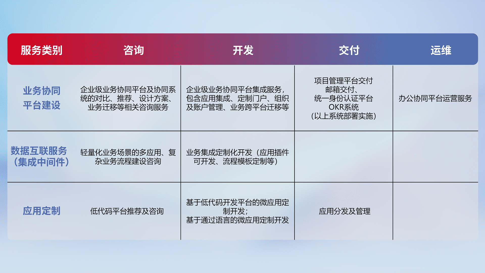 针对钉钉、、、企微、、IDaas等平台级产品提供产品的规划、、、、方案、、、交付、、、、定制化开发等服务,,实现如统一协同办公、、、智能客户服务、、、混合会议管理、、智能数据查询、、、、等业务场景,,实现数字化转型。。。