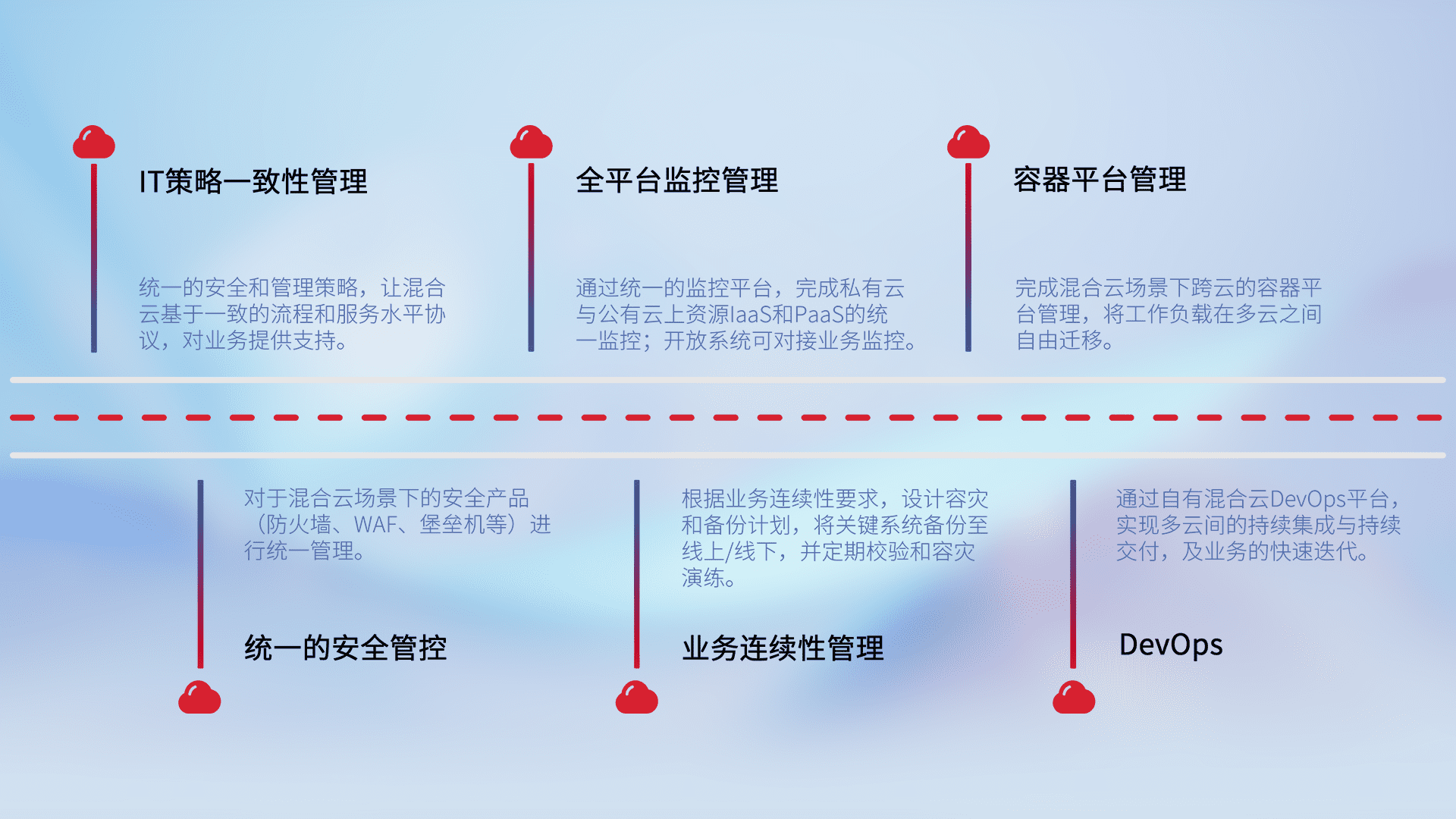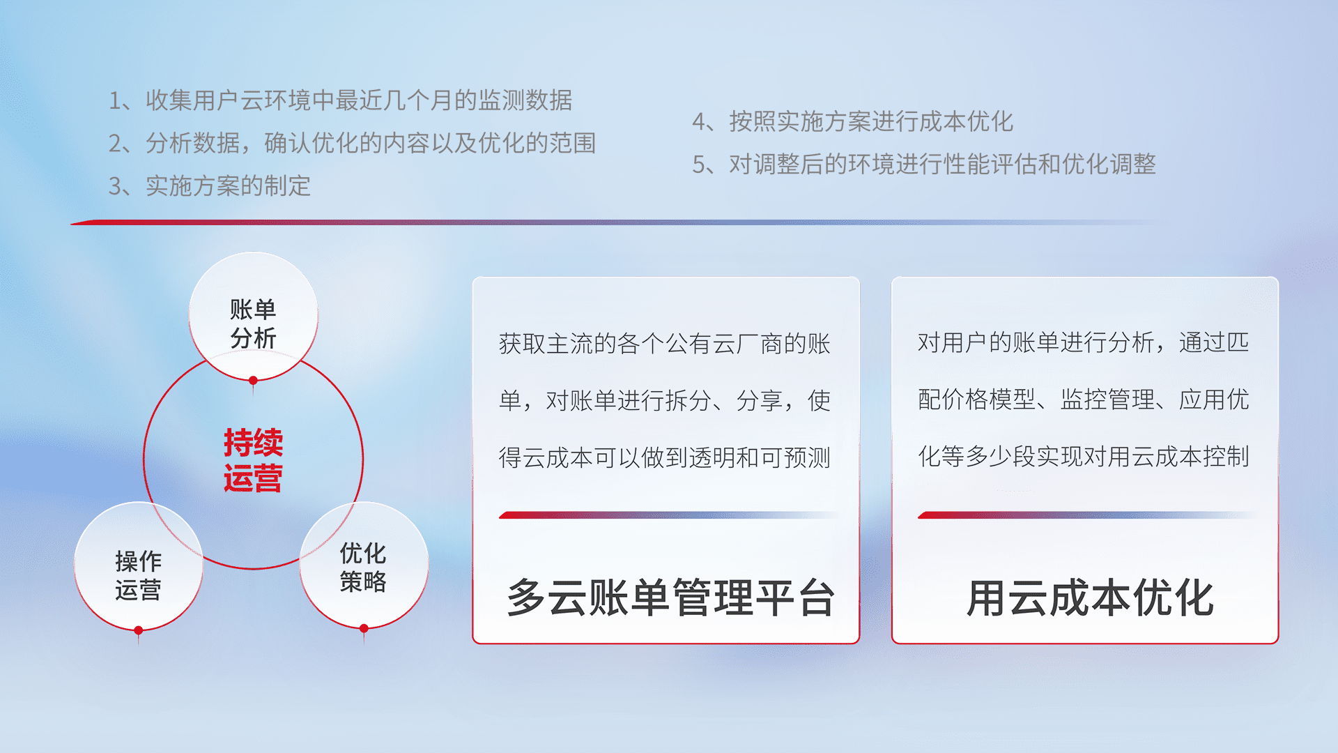 通过多云纳管,,以统一的资源数据模型把客户的云资源进行抽象和封装,,,,进而实现对多云资源的统一操作,,保障云资源管理的可靠性、、、稳定性与可用性。。。量身定制化运维内容,,,,配置、、、、开发运维、、、补丁管理、、、备份、、、、监控、、、、认证和访问管理、、审计和日常巡检等,,,,保障在用云过程中的可靠度,,,,稳定度以及高可用率。。。。
