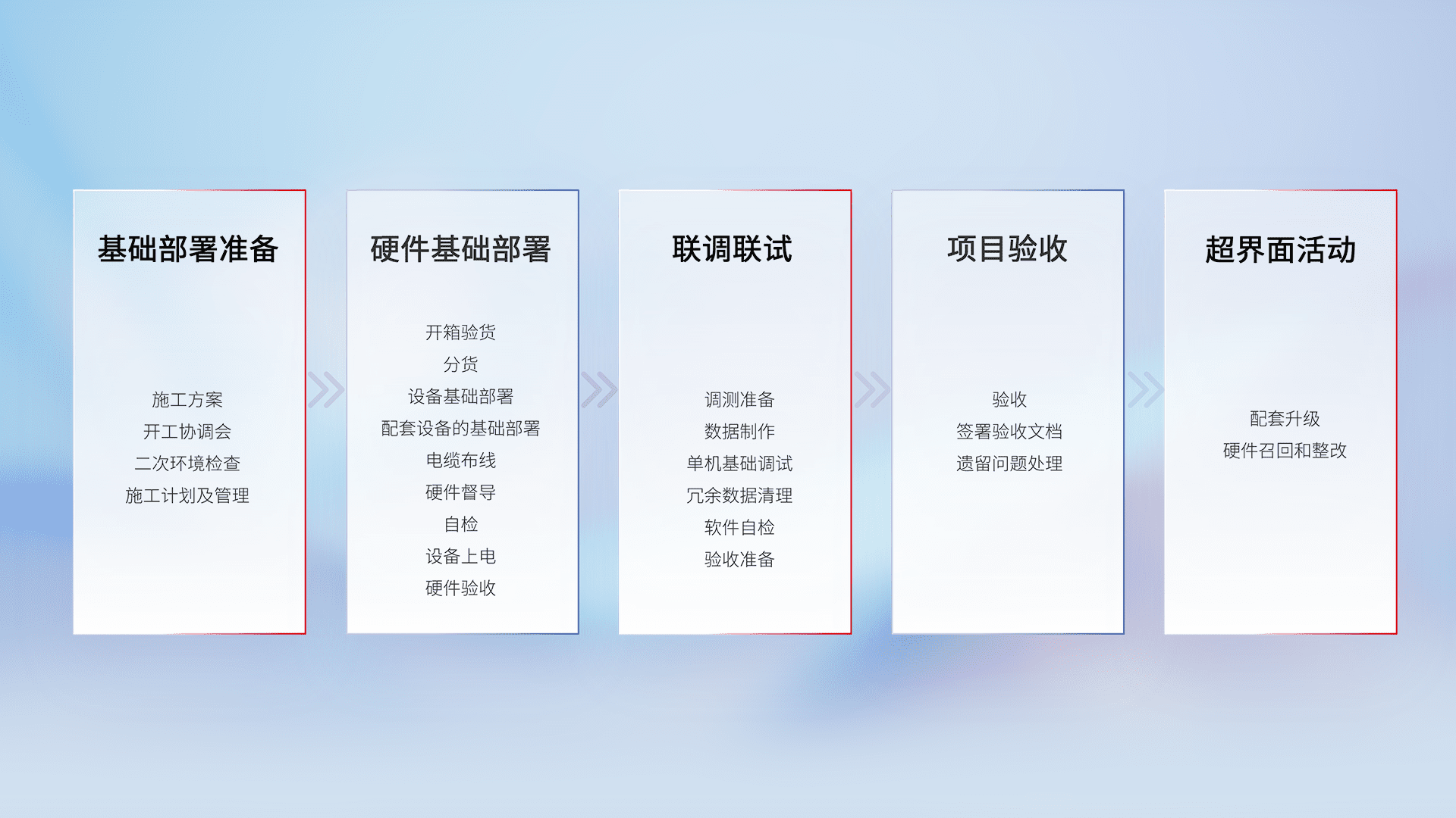 从基础部署准备、、、硬件基础部署、、、、联调联试、、项目验收、、越界面活动的全过程可追溯,,,,保证施工质量和进度。。。